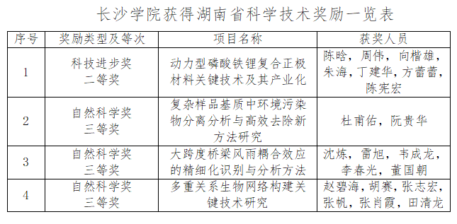 作为第一完成单位共有4个项目获得湖南省科学技术奖励,其中获科技进步奖二等奖1项、自然科学奖三等奖3项。