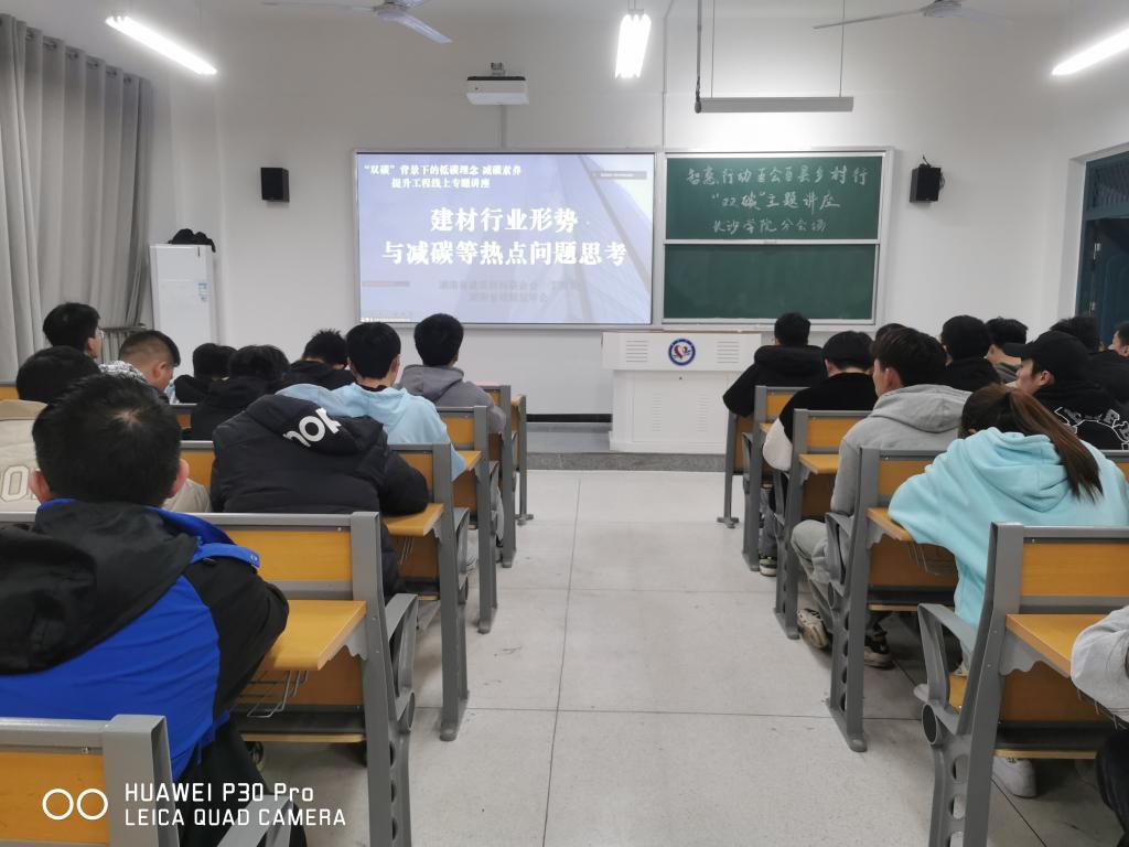 建材产业是湖南省的优势产业之一,但由于我省建材产业规模大,“碳达峰”任务艰巨。报告中,丁美荣高级工程师分析研判了我国建材行业“碳达峰”时间,并全面细致讲解了碳减排关键路径与混凝土固碳等减排等技术;肖汉宁教授详细介绍了湖南建材行业碳排放现状,重点阐述了湖南建材行业“碳达峰”实施方案,精心分享了水泥行业绿色工厂示范案例。与会师生一致认为,通过聆听此次专题讲座,更加深化了对我国“双碳”战略的理解,全面认识到我省建材行业碳排放的现状和面临的挑战,系统了解了我省建材行业为实现“双碳”目标而制定的新方案、开发的新技术和实施的新举措。大家纷纷表示,要深刻领悟习近平总书记的生态文明思想,紧密围绕我省建材行业“碳达峰”目标实现而优化教学内容、加快研发进度、学好专业知识、提升减碳素养,奋力提高我省建材行业绿色低碳发展水平与人才培养成效,为全面落实我省“三高四新”战略定位与使命任务贡献自己的力量。